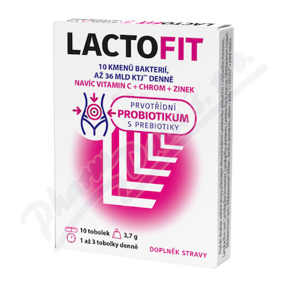 Lactofit everyday je vhodný pro každodenní podporu imunity. Obsahuje vybrané druhy probiotických bakterií, fruktooligosacharid inulin (prebiotikum), vitamin C a D3.