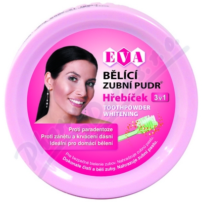 Bělící zubní pudr je náhradou zubní pasty, určen pro domácí bezpečné bělení zubů. Pudr s obsahem hřebíčku působí proti bolesti a krvácení dásní, odstraňuje zubní kámen, pravidelné používání je účinnou prevencí proti paradentóze, velmi silný efekt.