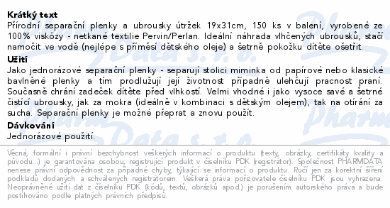 Přírodní separační plenky a ubrousky útržek 19x31cm, 150 ks v balení, vyrobené ze 100% viskózy - netkané textilie Pervin/Perlan. Ideální náhrada vlhčených ubrousků, stačí namočit ve vodě (nejlépe s příměsí dětského oleje) a šetrně pokožku dítěte ošetřit.