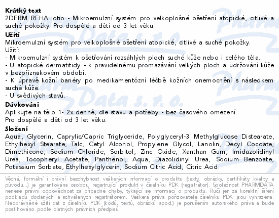 2DERM REHA lotio - Mikroemulzní systém pro velkoplošné ošetření atopické, citlivé a suché pokožky. Pro dospělé a děti od 3 let věku.