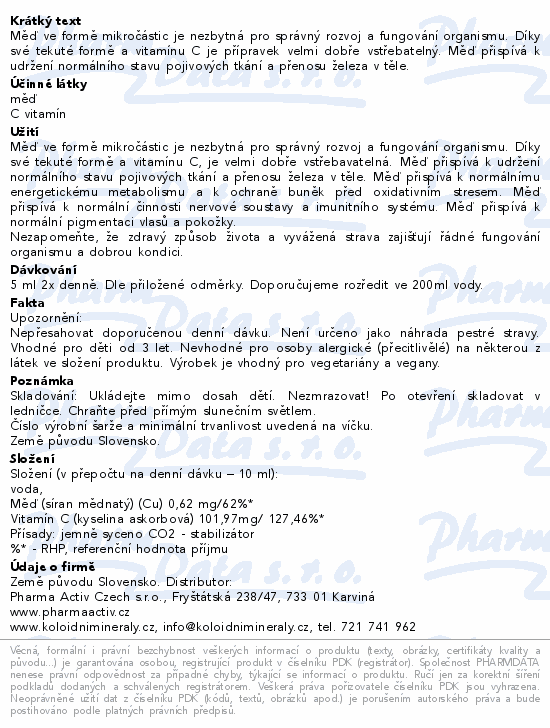 Měď ve formě mikročástic je nezbytná pro správný rozvoj a fungování organismu. Díky své tekuté formě a vitamínu C je přípravek velmi dobře vstřebatelný. Měď přispívá k udržení normálního stavu pojivových tkání a přenosu železa v těle.