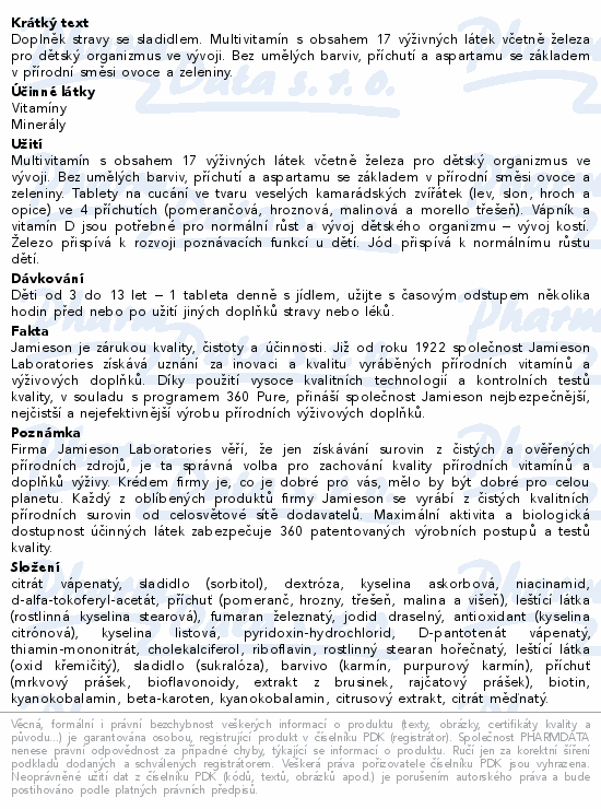 Doplněk stravy se sladidlem. Multivitamín s obsahem 17 výživných látek včetně železa pro dětský organizmus ve vývoji. Bez umělých barviv, příchutí a aspartamu se základem v přírodní směsi ovoce a zeleniny.