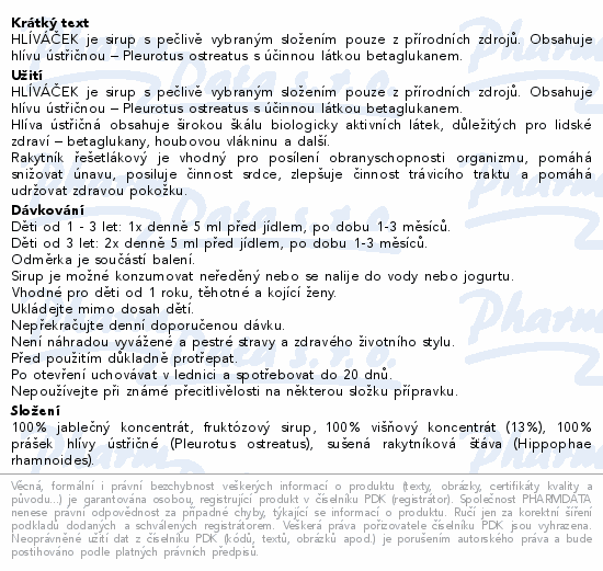 HLÍVÁČEK je sirup s pečlivě vybraným složením pouze z přírodních zdrojů. Obsahuje hlívu ústřičnou – Pleurotus ostreatus s účinnou látkou betaglukanem.