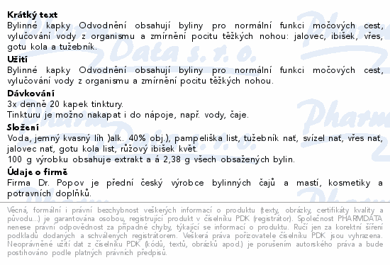 Bylinné kapky Odvodnění obsahují byliny pro normální funkci močových cest, vylučování vody z organismu a zmírnění pocitu těžkých nohou: jalovec, ibišek, vřes, gotu kola a tužebník.