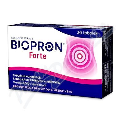 BIOPRON Forte obsahuje speciální kombinaci probiotických bakterií (Lactobacillus acidophilus, Lactobacillus rhamnosus) a probiotických kvasinek Saccharomyces boulardii doplněnou o prebiotické fruktooligosacharidy.