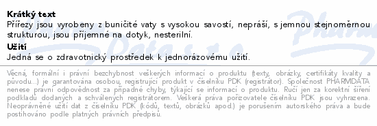 Přířezy jsou vyrobeny z buničité vaty s vysokou savostí, nepráší, s jemnou stejnoměrnou strukturou, jsou příjemné na dotyk, nesterilní.