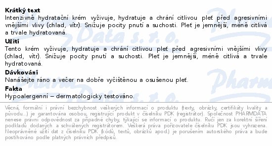 Intenzivně hydratační krém vyživuje, hydratuje a chrání citlivou pleť před agresivními vnějšími vlivy (chlad, vítr). Snižuje pocity pnutí a suchosti. Pleť je jemnější, méně citlivá a trvale hydratovaná.