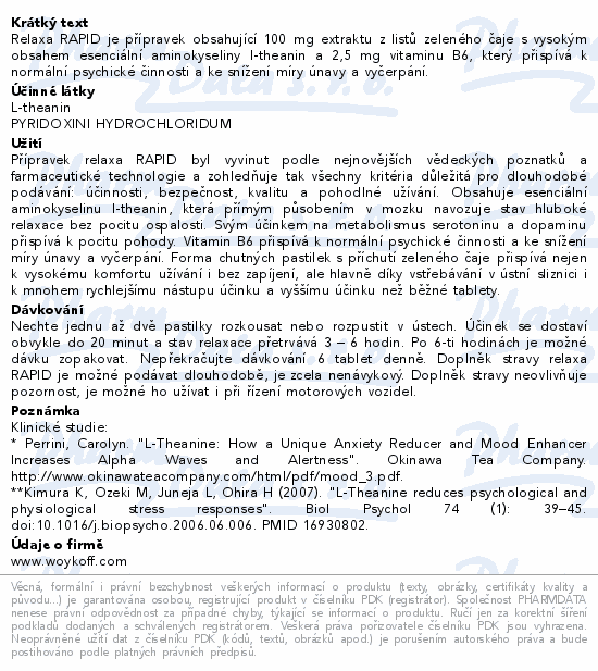 Relaxa RAPID je přípravek obsahující 100 mg extraktu z listů zeleného čaje s vysokým obsahem esenciální aminokyseliny l-theanin a 2,5 mg vitaminu B6, který přispívá k normální psychické činnosti a ke snížení míry únavy a vyčerpání.