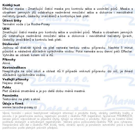 Effaclar maska - Zmatňující čisticí maska pro kontrolu séba a uvolnění pórů. Maska s obsahem jemných jílů odstraňuje nadměrné množství séba a dokonce i neviditelné nečistoty (prach, částečky znečištění) a kontroluje lesk pleti.
