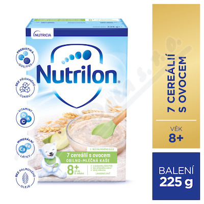 Potravina pro obilnou výživu, obilný příkrm určený pro kojence a malé děti od ukončeného 8. měsíce, v prášku. Obilno-mléčná kaše 7 cereálií s ovocem.