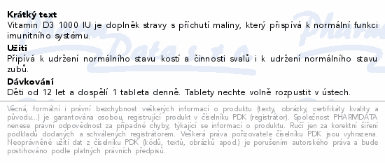 Vitamin D3 1000 IU je doplněk stravy s příchutí maliny, který přispívá k normální funkci imunitního systému.
