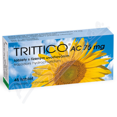 Přípravek Trittico AC obsahuje jako léčivou látku trazodon-hydrochlorid. Patří mezi antidepresiva s výrazným působením proti úzkosti, pocitům napětí, neklidu, poruchám spánku a sexuálních funkcí. Přípravek je vhodný i pro starší pacienty. Čtěte pozorně příbalový leták.