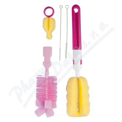 Sada kartáčů k bezpečnému čištění láhví a saviček před jejich sterilizací. Sada obsahuje kartáč s hubkou, pěnový kartáč, pěnový kartáček na savičky a dva malé kartáčky.