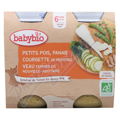 Kombinace bio hrášku, pastináku, cukety a farmářského telecího masa z oblasti Aquitaine a Limousin. Lahodné a vydatné hlavní jídlo pro malé gurmány od 6 měsíců. Bez přidané soli, zahušťovadel, umělých dochucovadel a konzervantů. Připraveno na páře.