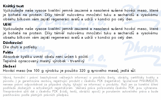 Vyzkoušejte naše vysoce kvalitní jemně zauzené a nasolené sušené hovězí maso, které je bohaté na protein. Díky téměř nulovému množství tuku a sacharidů a vysokému obsahu bílkovin vám zajistí regeneraci svalů a udrží v kondici po celý den.