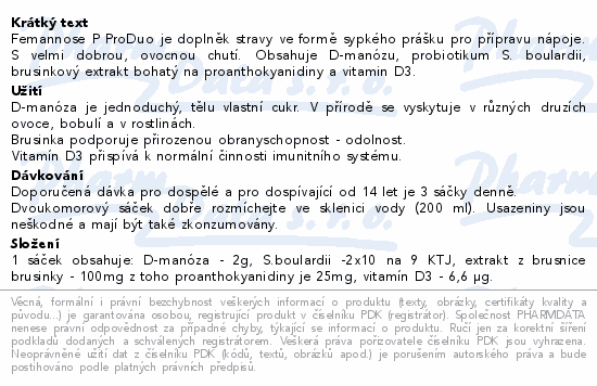 Femannose P ProDuo je doplněk stravy ve formě sypkého prášku pro přípravu nápoje. S velmi dobrou, ovocnou chutí. Obsahuje D-manózu, probiotikum S. boulardii, brusinkový extrakt bohatý na proanthokyanidiny a vitamin D3.