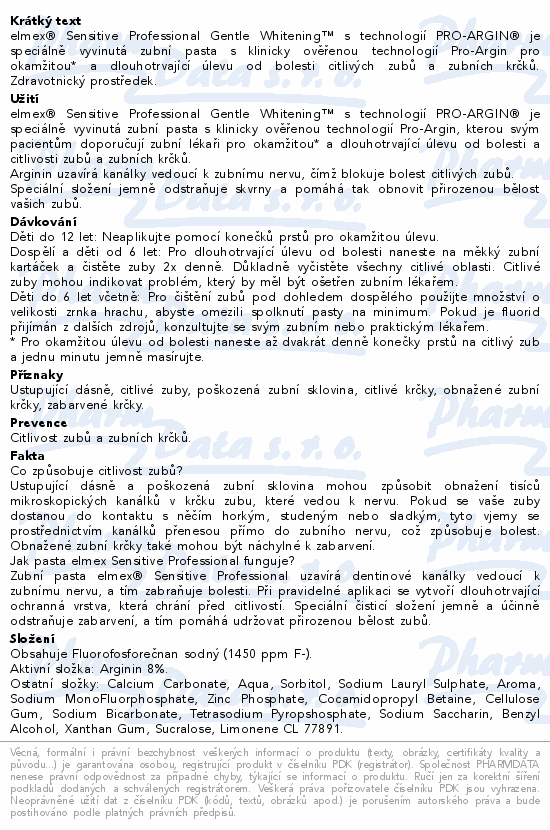 elmex® Sensitive Professional Gentle Whitening™ s technologií PRO-ARGIN® je speciálně vyvinutá zubní pasta s klinicky ověřenou technologií Pro-Argin pro okamžitou* a dlouhotrvající úlevu od bolesti citlivých zubů a zubních krčků. Zdravotnický prostředek.