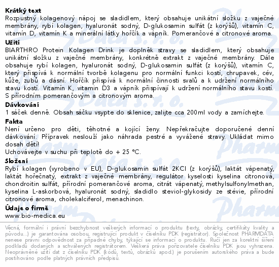 Rozpustný kolagenový nápoj se sladidlem, který obsahuje unikátní složku z vaječné membrány, rybí kolagen, hyaluronát sodný, D-glukosamin sulfát (z korýšů), vitamín C, vitamín D, vitamín K a minerální látky hořčík a vápník. Pomerančové a citronové aroma.