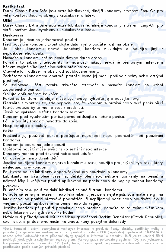 Durex Classic Extra Safe jsou extra lubrikované, silnější kondomy s tvarem Easy-On pro větší komfort. Jsou vyrobeny z kaučukového latexu.