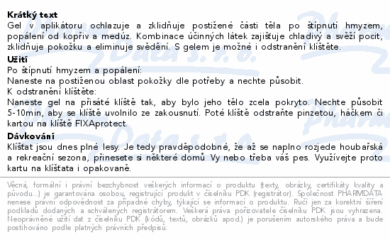 Gel v aplikátoru ochlazuje a zklidňuje postižené části těla po štípnutí hmyzem, popálení od kopřiv a medúz. Kombinace účinných látek zajišťuje chladivý a svěží pocit, zklidňuje pokožku a eliminuje svědění. S gelem je možné i odstranění klíštěte.