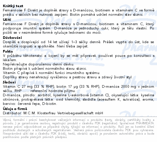 Femannose F Direkt je doplněk stravy s D-manózou, biotinem a vitaminem C ve formě prášku v sáčcích bez nutnosti zapíjení. Biotin pomáhá udržet normální stav sliznic.
