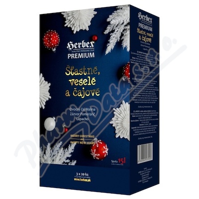 Vánoční dárkové balení čajů HERBEX, složeno z Ovocný čaj s příchutí malina 20x2 g, Zázvor s příchutí pomeranč 20x2 g a Lapacho + rooibos, skořice a hřebíček 20x2 g.