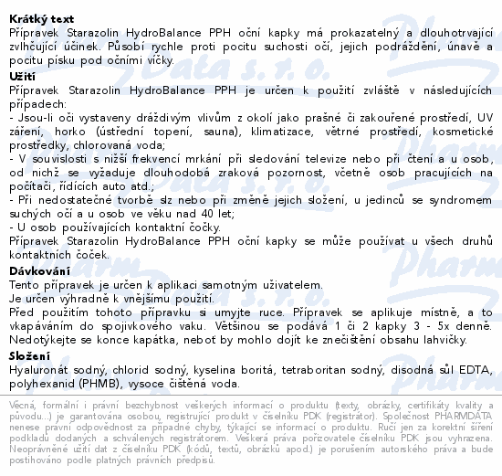 Přípravek Starazolin HydroBalance PPH oční kapky má prokazatelný a dlouhotrvající zvlhčující účinek. Působí rychle proti pocitu suchosti očí, jejich podráždění, únavě a pocitu písku pod očními víčky.