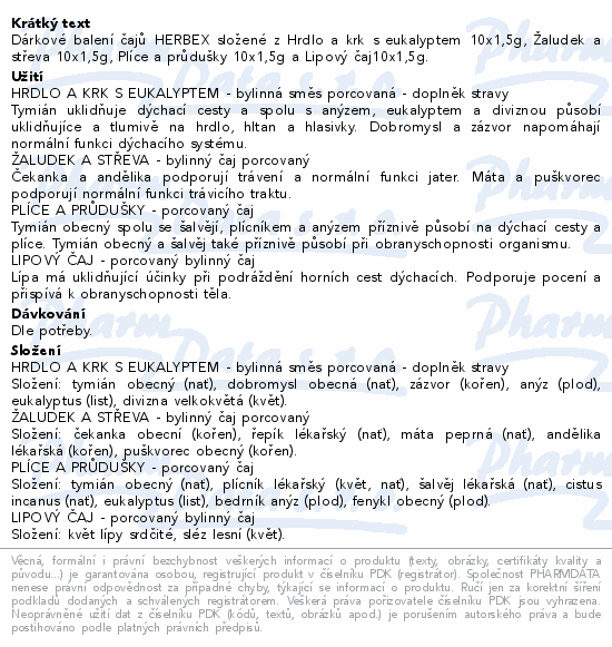 Dárkové balení čajů HERBEX složené z Hrdlo a krk s eukalyptem 10x1,5g, Žaludek a střeva 10x1,5g, Plíce a průdušky 10x1,5g a Lipový čaj10x1,5g.