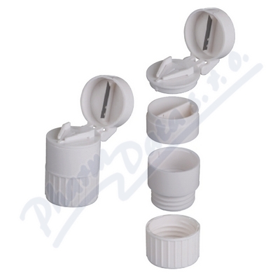 Kapesní zásobník na léky se čtyřmi funkcemi: drtič tablet, půlič tablet, nádobka na rozpuštění tablety a zásobník na léky.