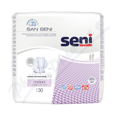 Prodyšné vložné pleny San Seni Maxi se savostí 2000ml, 30ks. Upevňují se pomocí síťových kalhotek San Seni. Díky anatomickému tvaru se skvěle přizpůsobí tělu. Dvojité savé jádro pro větší pocit sucha a vnitřní boční záhyby, které zabraňují úniku moči.
