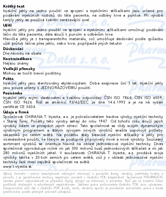Injekční jehly na jedno použití ve spojení s injekčními stříkačkami jsou určené pro podávání injekčních roztoků do těla pacienta, na odběry krve a punkce. Při výrobě kanyly jehly se používá kvalitní nerezavějící ocel.