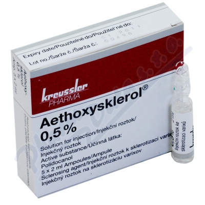 Aethoxysklerol je sklerotizační látka určená k lokální injekci a obsahuje léčivou látku lauromakrogol 400 (polidokanol). Aethoxysklerol se používá k léčbě křečových žil, hemoroidů a akutních krvácejících jícnových křečových žil. Čtěte pozorně příbalový leták.