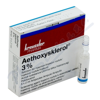 Přípravek je indikován u sklerotizace varixů a hemoroidů a u endoskopické sklerotizace jícnových varixů při akutním krvácení z jícnových varixů. Pro tuto terapeutickou indikaci se používá Aethoxysklerol 1% balený v lahvičkách 30 ml. Čtěte pozorně příbalový leták.